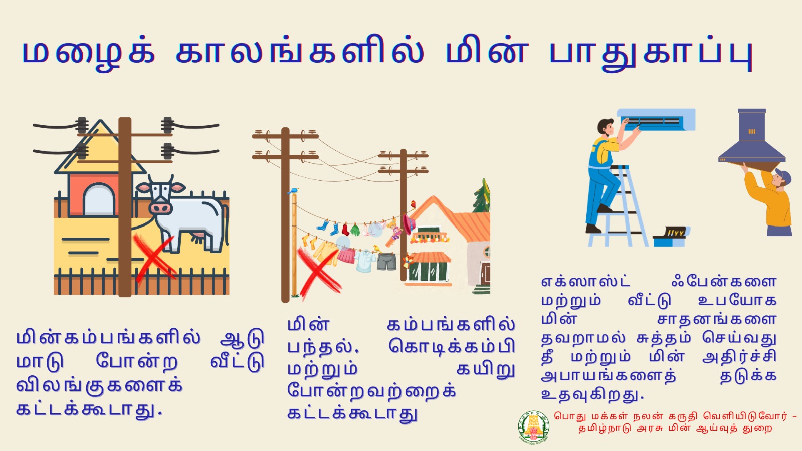 * மின் கம்பத்திலோ அல்லது அவற்றை தாங்கும் கம்பங்களிலோ கால்நடைகளை கட்டி வைக்க வேண்டாம்.
