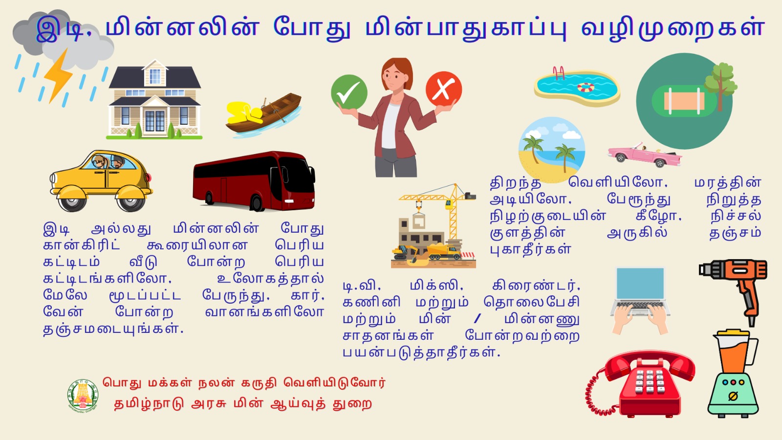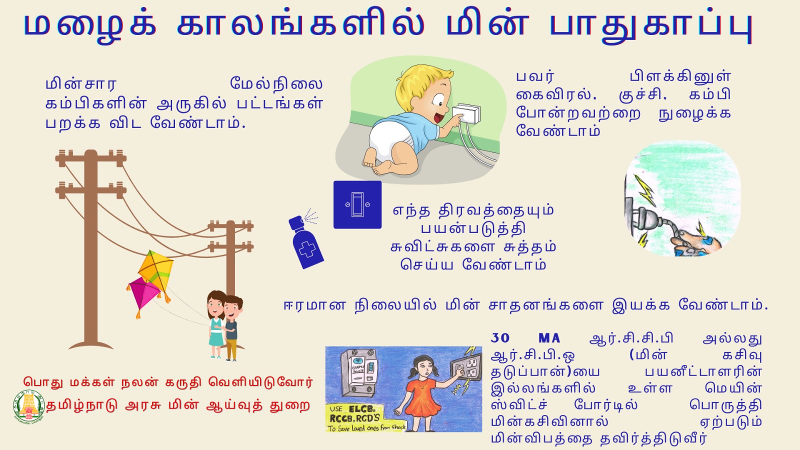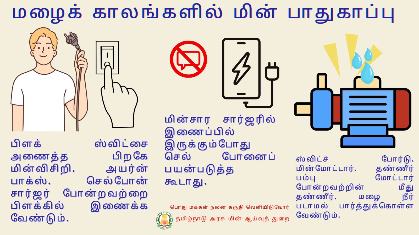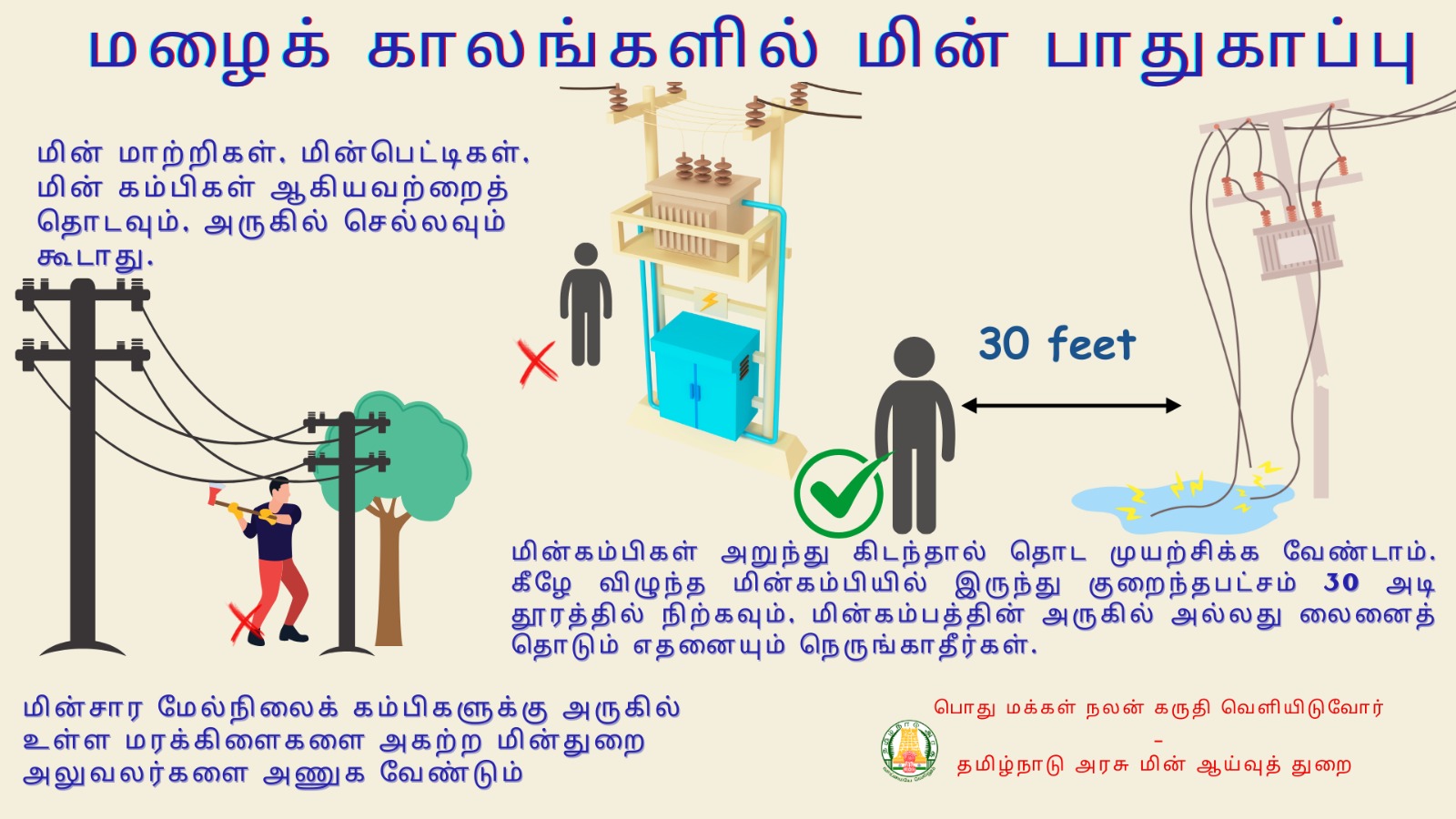 * சாலைகளிலும். தெருக்களிலும் மின்கம்பங்கள் மற்றும் மின் சாதனங்களுக்கருகே தேங்கிக்கிடக்கும் தண்ணீரில் நடப்பேதா, ஓடுவேதா விளையாடுவேதா மற்றும் வாகனத்தில் செல்வேதா தவிர்க்கப்பட வேண்டும்.