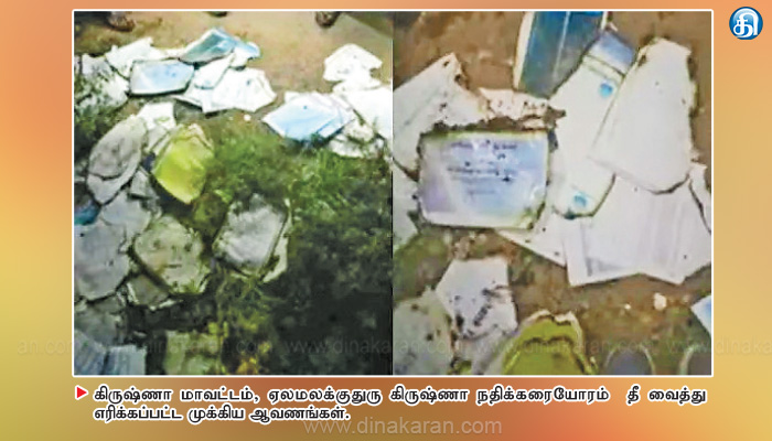 இந்நிலையில் கிருஷ்ணா மாவட்டம் பெனமலூர் தொகுதி ஏலமலக்குதுரு கிருஷ்ணா நதிக்கரையோரம் நேற்று முன்தினம் இரவு சந்தேகப்படும்படி 2 பேர் நின்று தீவைத்து எதையோ எரித்துக்கொண்டிருந்தனர். இதனைக்கண்ட பொதுமக்கள் அருகே சென்று பார்த்தனர். அதில் முக்கியமான ஆவணங்கள் மற்றும் ஹார்டு டிஸ்க் எரித்துக்கொண்டிருப்பது தெரியவந்தது.