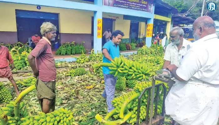 பொள்ளாச்சி காந்தி மார்க்கெட்டுக்கு சில மாதமாக சுற்று வட்டார பகுதி மட்டுமின்றி, தூத்துக்குடி மற்றும் திருச்சி உள்ளிட்ட வெளியூர்களில் இருந்து வாழைத்தார் வரத்து சற்று அதிகமாக இருந்துள்ளது. இருப்பினும், கடந்த சில வாரமாக விஷேச நாட்கள் குறைவால் அனைத்து ரக வாழைத்தார்களின் விலையும் சற்று குறைவாக இருந்தது.