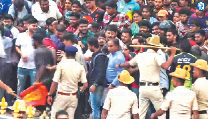 விதான சவுதா பகுதியில் ஆயிரக்கணக்கான ரசிகர்கள் திரண்டதால் கடும் கூட்ட நெரிசல் ஏற்பட்டது. கூட்ட நெரிசலில் சிக்கிய ரசிகர்கள், மைதானத்திற்குள் செல்வதற்கான அனைத்து முயற்சிகளையும் முரட்டுத்தனமாக மேற்கொண்டனர். சில ரசிகர்கள் ஸ்டேடியத்தை ஒட்டியிருந்த மரத்தின் மீது ஏறினர். கூட்ட நெரிசலை கட்டுப்படுத்த முடியாமல் போலீசார் திணறினர்.