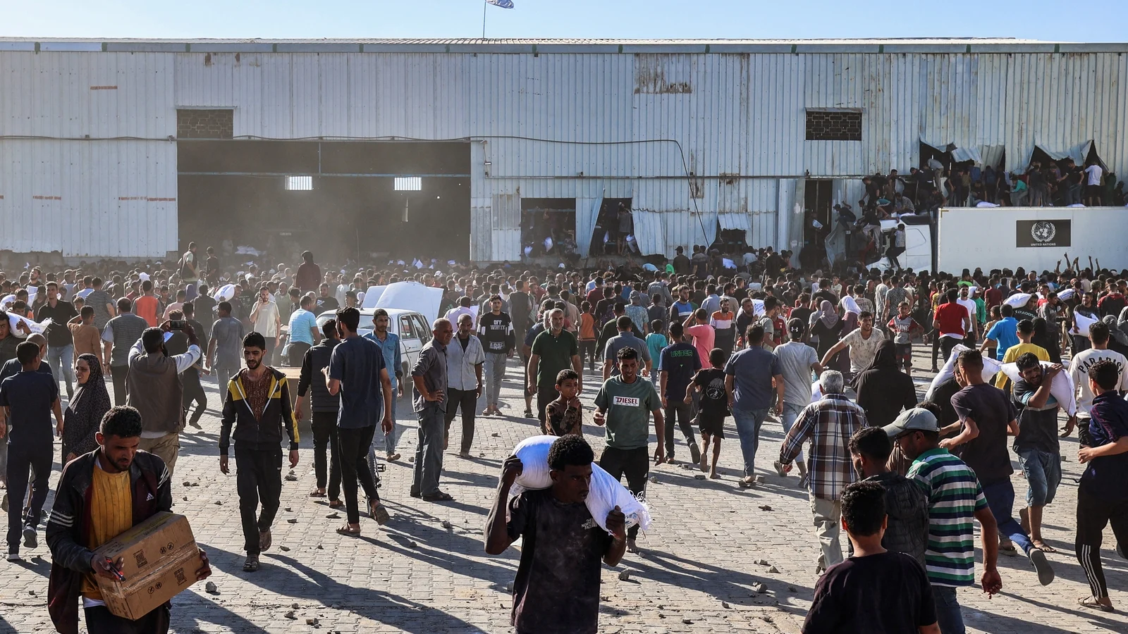 பின்னர் அங்கு வைக்கப்பட்டிருந்த கோதுமை மாவு, அரிசி, குடிநீர் பாட்டில்களை அவர்கள் அள்ளி சென்றனர். இதனால் பெரும் பரபரப்பு ஏற்பட்டதை அடுத்து வானத்தை நோக்கி துப்பாக்கியால் சுட்ட ஐநா பாதுகாப்பு காவலர்கள் கூட்டத்தை கலைத்தனர். ஐநா சபையின் நிவாரண முகாமை மக்கள் சூறையாடிய நிலையில் காஸாவில் நிலவும் உணவு பஞ்சத்த்தின் தீவிரத்தை உலகிற்கு உணர்த்துவதாக இருக்கிறது. இந்நிலையில் காஸாவில் உணவு பொருள் விநியோகத்தை உடனடியாக அதிகரிக்க ஐநா வேண்டுகோள் விடுத்துள்ளது.