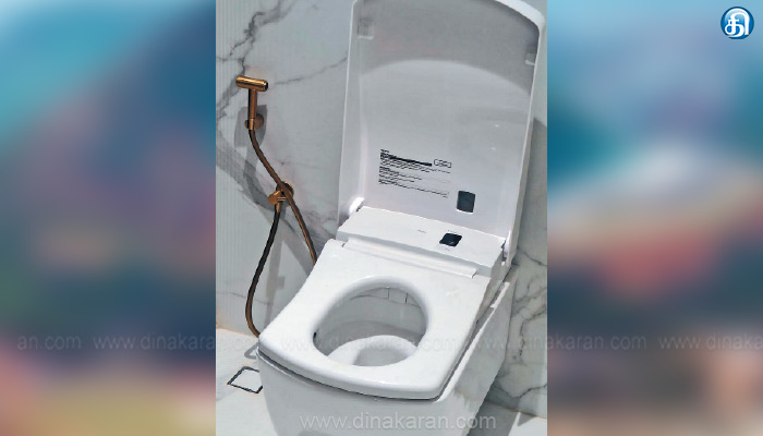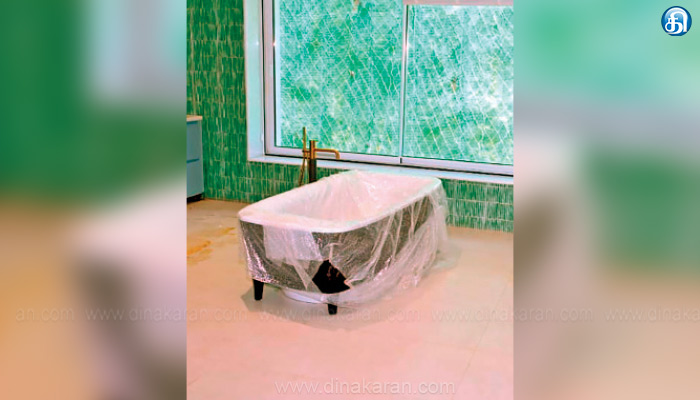 ரூ.36 லட்சத்தில் பாத் டப் வைக்கப்பட்ட கழிப்பறையில் குழாய் கூட தங்கமாய் ஜொலிக்குது.