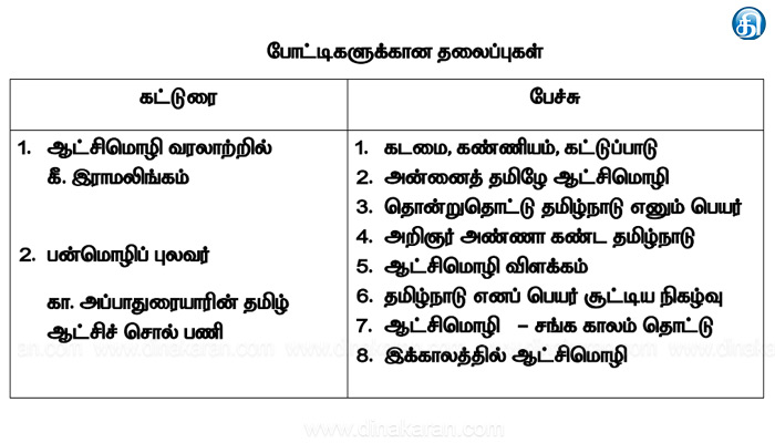 மாநிலப் போட்டியில் கலந்து கொண்டு முதல் மூன்று இடம் வகிக்கும் மாணவர்களுக்கு சூலை 18ஆம் நாளன்று நடைபெறும் தமிழ்நாடு நாள் விழாவில் பரிசு மற்றும் பாராட்டுச் சான்றிதழ் வழங்கிச் சிறப்பிக்கப்பெற்று வருகின்றனர்.