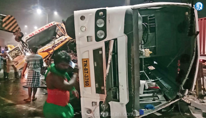 அப்போது, தண்டலம் அருகே சென்னை- பெங்களூரு தேசிய நெடுஞ்சாலையில் சாலையை கடக்க முயன்றபோது, பின்னால் வந்த சிமெண்ட் கலவை ஏற்றி வந்த லாரி பயங்கரமாக மோதியது. இதில், பேருந்து கவிழ்ந்தது லாரியின் முன்பகுதி நொறுங்கியது. பேருந்தில் பயணம் செய்த கம்பெனி ஊழியர்கள் அலறி கூச்சலிட்டனர். மேலும், எதிர்திசையில் சென்னையில் இருந்து பெங்களூருவை நோக்கி சென்ற கார் மீதும் பேருந்து மோதியதில் காரும் சேதமானது.