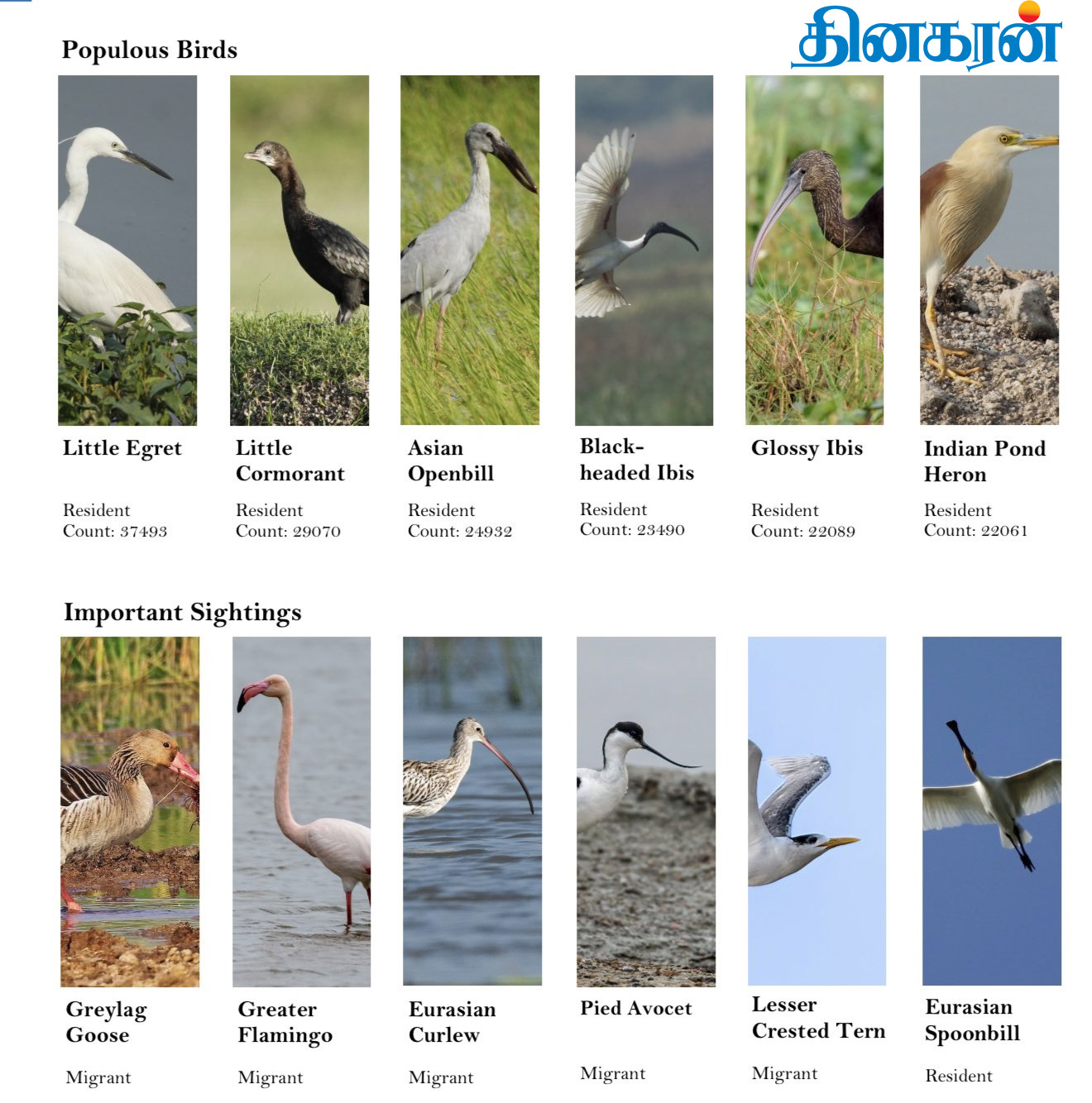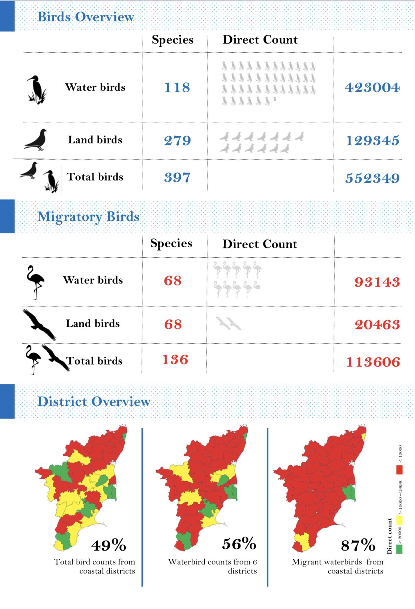 934 இடங்களில் ஈர நிலப் பறவைகள் கணக்கெடுப்பு நடத்தப்பட்டு, 397 பறவை இனங்களைச் சேர்ந்த 5,52,349 பறவைகள் கணக்கிடப்பட்டுள்ளன. இவற்றில், 1,13,606 பறவைகள் இடம்பெயரும் பறவைகள் மற்றும் 49% பறவைகள் கடலோர மாவட்டங்களைச் சேர்ந்தவை. சின்னக்கொக்கு/கள்ளவாயன் (Little egret), சிறிய நீர்க்காகம் (Little cormorant), நத்தைகுத்தி நாரை (Asian open bill), கருந்தலை அரிவாள்மூக்கன் (Black headed Ibis), அன்றில் (Glossy Ibis) மற்றும் குளக்கொக்கு (Indian pond Heron) ஆகியவை வசிக்கும் பறவைகளில் மிகவும் பொதுவான பறவைகளாக காணப்பட்டன. சாம்பல்நிற வாத்து (Greylag Goose), பெரும் பூநாரை (Greater Flamingo), பெரியகோட்டான் (Eurasian Curlew), கோணமூக்கு உள்ளான் (Pied Avocet), சிறிய கொண்டை ஆலா (Lesser Crested Tern) மற்றும் கரண்டிவாயன் (Eurasian Spoon bill) ஆகியவை புலம்பெயர்ந்த பறவைகளில் மிகவும் பொதுவான பறவைகளாக காணப்பட்டன.